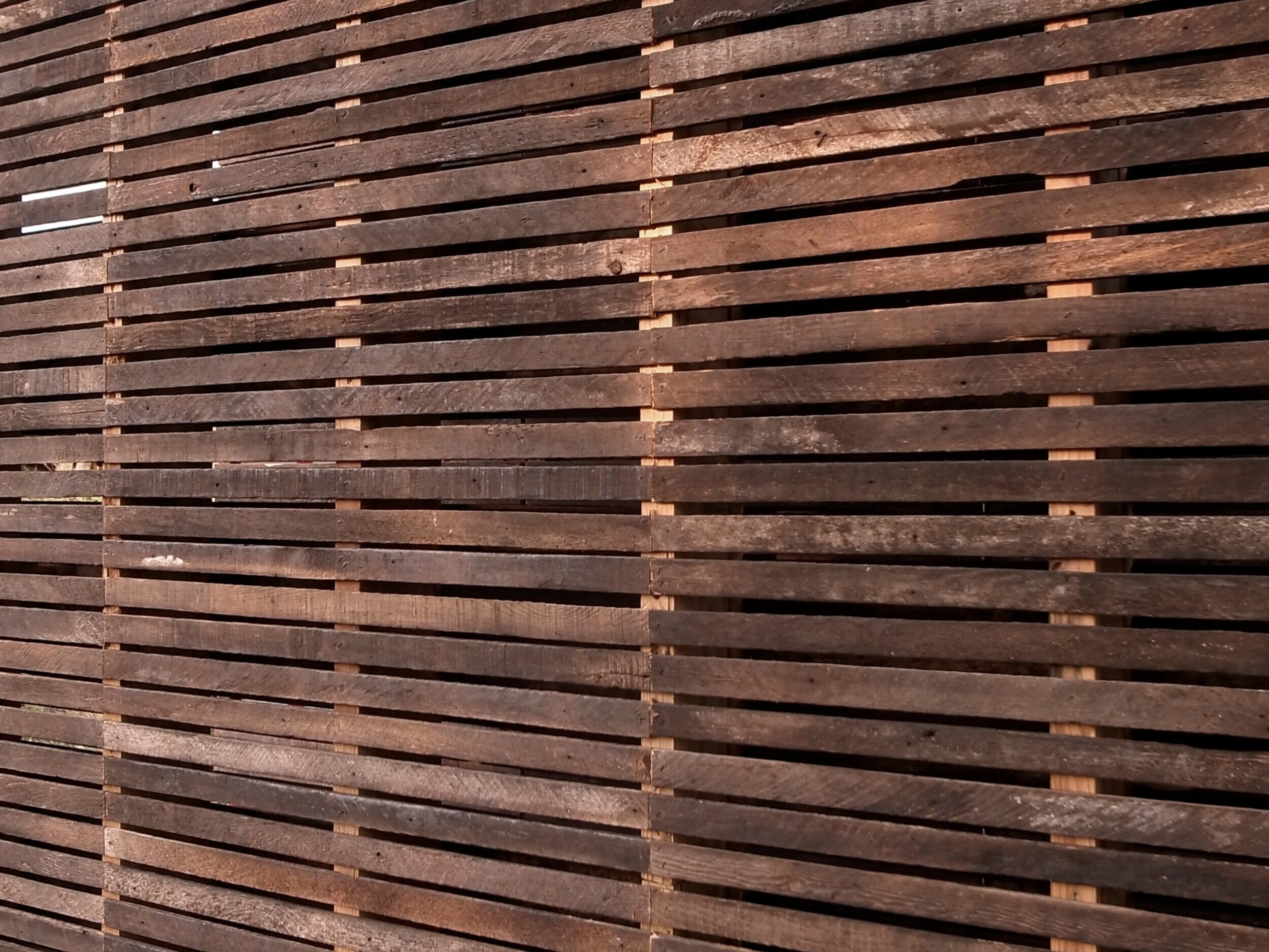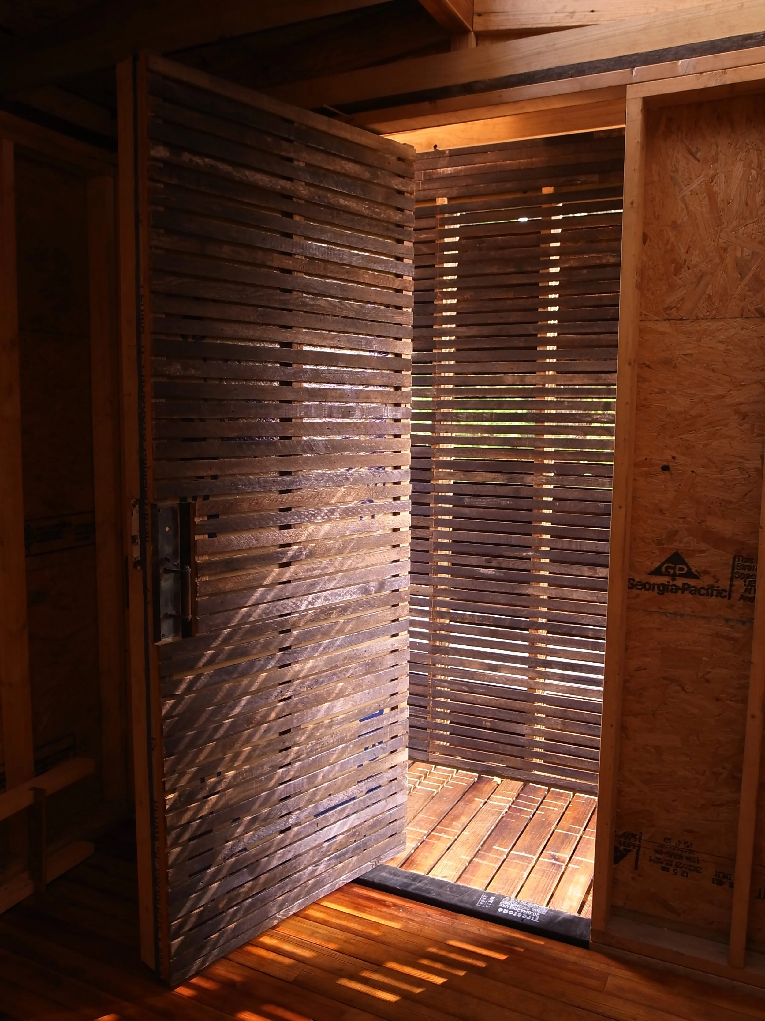 We constructed the floor and roof structures entirely from reclaimed barn lumber, and the exterior siding is composed of lath from a 100-year-old house demolished in nearby Grand Island. The floorboards were also salvaged from the same demolition.