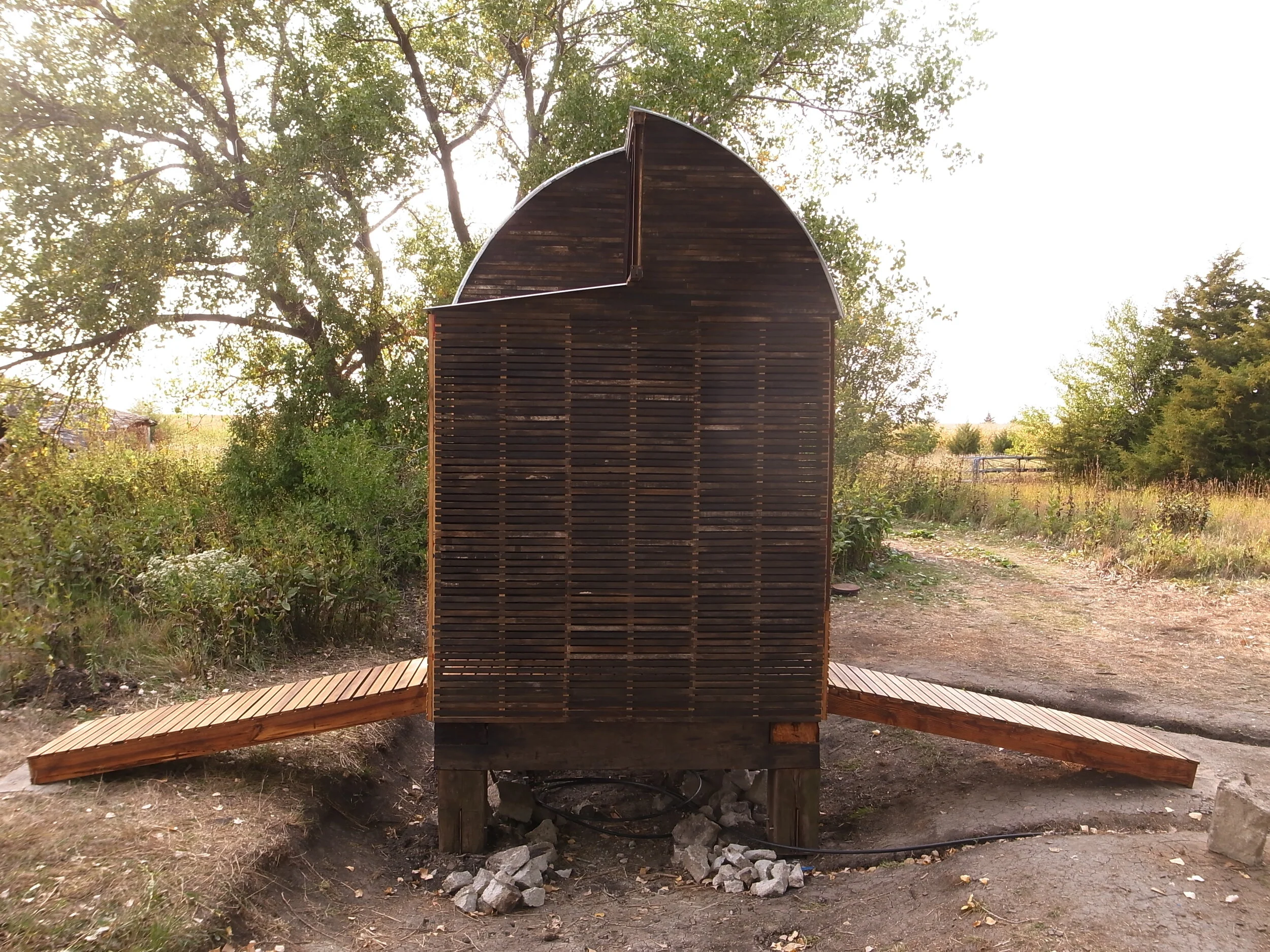 The roof surface is assembled from six grain bin sidewall panels oriented vertically. The truss-like armature supporting these panels is assembled from four pallet rack frames stiffened with steel hollow structural sections, then bolted and welded together.