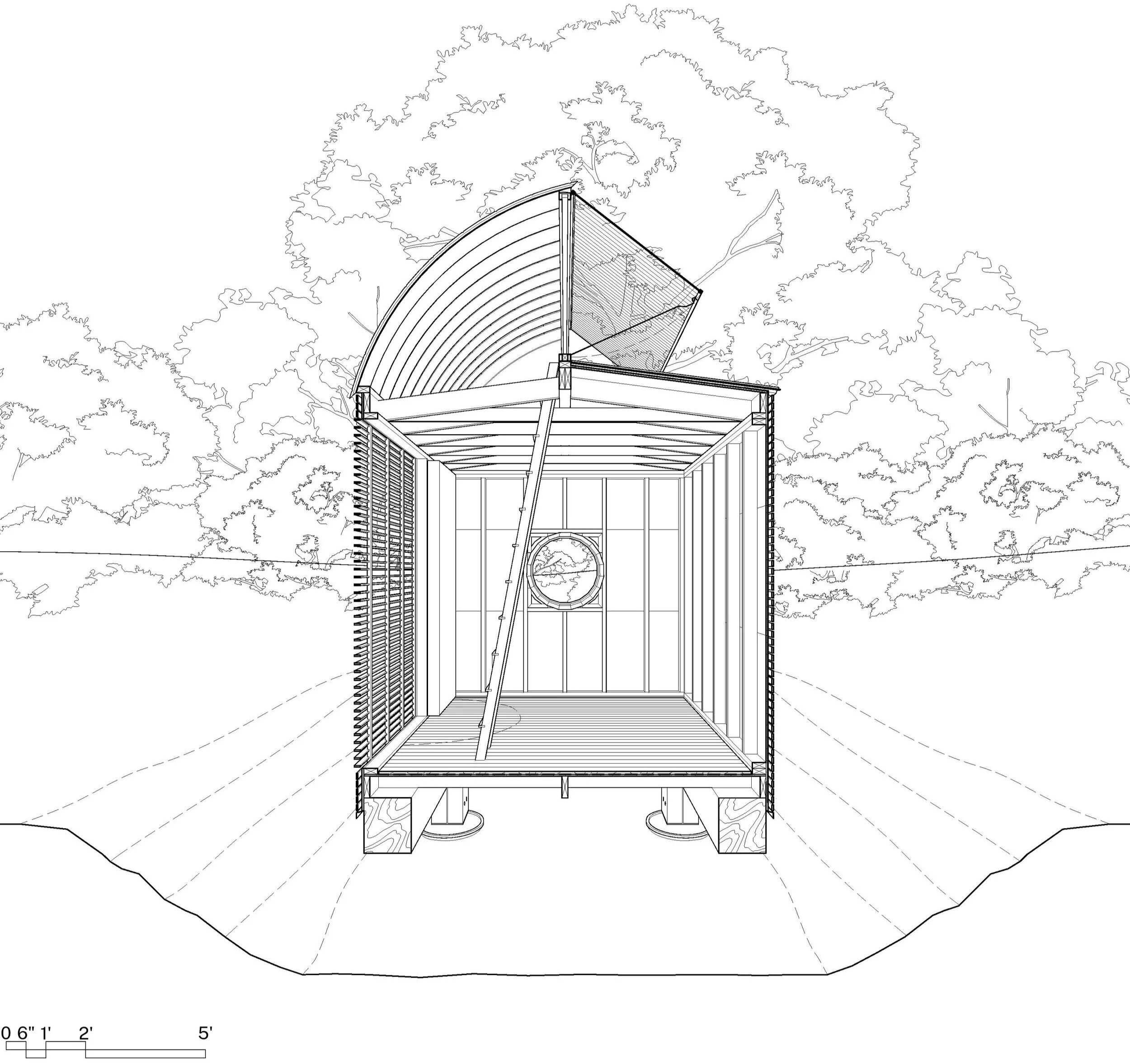 We imagined the studio as a simple rectilinear volume on piers topped by a long, curved light monitor. When viewed from its eastern or western orientations, the roof’s form recalls the pointed arch commonly seen in many local agricultural structures. In our early design sessions, we often described the studio as “a box with a hat.”